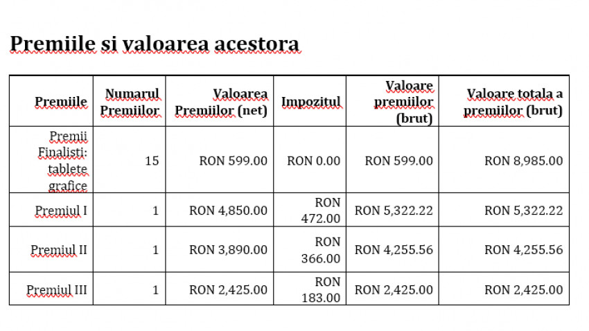 Autorii primelor 15 lucrari finaliste dupa etapa 1 de evaluarea vor primi fiecare cate o tableta grafica.