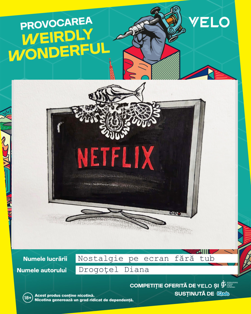 Un televizor modern împodobit cu mileul și peștele de sticlă din vremurile comuniste , o antiteză între nou și vechi, între cultura digitală de azi și obiectele românești din trecut.