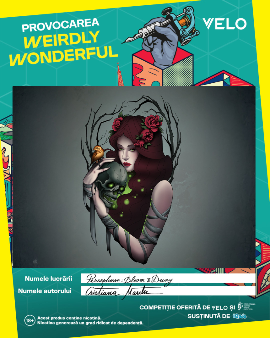 Persefona, zeita primaverii si regina lumii de dincolo, intruchipeaza opozitia existentei ei: cand este pe pamant, natura infloreste si se umple de viata, iar atunci cand trece in eternitate pentru a fi alaturi de Hades, anotimpurile isi pierd culoarea. Cu o coroana de trandafiri, rodii pe cap si un craniu in maini, ea simbolizeaza viata si moartea prin simpla ei prezenta. Pasarea galbena reprezinta caldura vietii, adaugand un contrast subtil langa coroana ei. Antiteza apare in contrastul vizual si simbolic dintre viata si moarte, lumina si intuneric, frumusetea efemera a naturii si certitudea lumii de apoi.