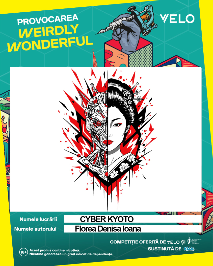 Design-ul împarte portretul unei Gheișe (simbol al frumuseții fragile și al ritualului) în două: o jumătate este grațioasă, în timp ce cealaltă este o expunere brutală de mecanisme, circuite și metal distopic (Cyber). Roșul vibrant accentuează ruptura și arată că esența sufletului (ochiul roșu, buzele) rezistă chiar și atunci când trupul devine protocol, armură sau mașină.