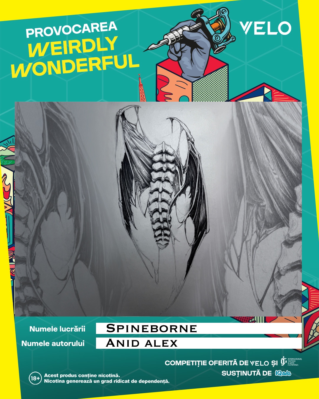 O întruchipare dark-fantasy, o malformare a coloanei cervicale umane. O piesă grafică în care decaderea omului se contopește cu dezintegrarea și deformarea, dar și cu ascensiunea lui într-o formă nouă, o ființă întunecată, reanimată prin chirurgia propriei mele imaginații.